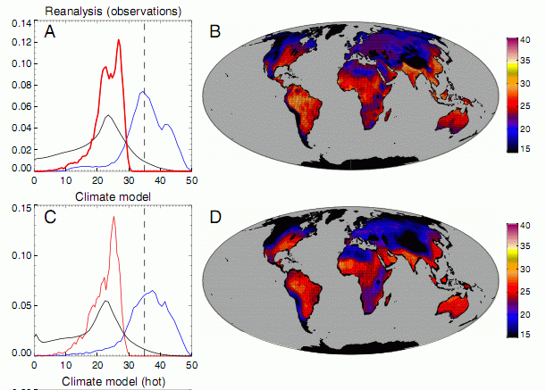 Górny panel to obserwacje (dokładniej oparte na nich reanalizy), a dolny to wyniki z modelu atmosferycznego CAM 3.1 dla porównania. Widać, że model dobrze sobie daje radę. Czarne linie na histogramach to rozkłady prawdopodobieństwa temperatur przy powierzchni ziemi, niebieskie to temperatury maksymalne (w ciągu roku) a czerwone to maksymalne (również w ciągu roku) temperatury termometru mokrego. To one nas interesują. Widać, że nigdzie na świecie nie przekraczają one 31°C, a nawet 30°C przekraczane jest w bardzo niewielu miejscach. Histogram gwałtownie się ucina przy tych wartościach. Wydaje się, że głęboka konwekcja (dla laików: burze) chłodzi skutecznie powierzchnię ziemi, jeśli zbliżymy się do tej granicy. Taka jest przynajmniej sugestia autorów.