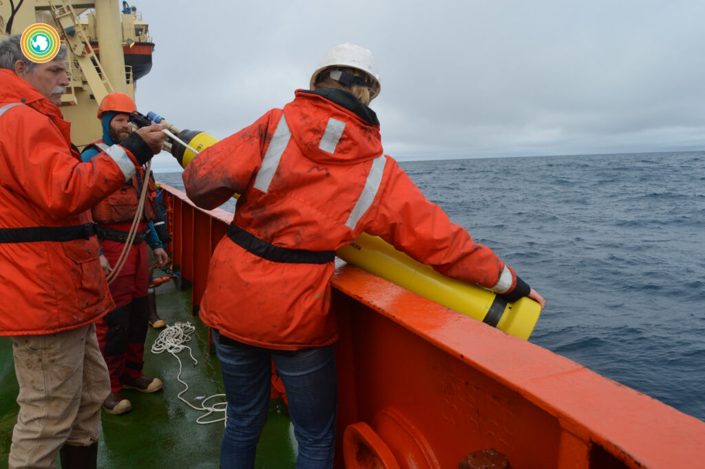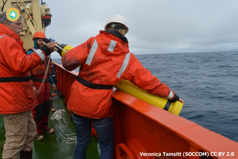 Rysunek 1: Naukowcy wrzucają do wody boję pomiarową podczas rejsu po Oceanie Południowym w ramach misji SOCCOM. Fot.: Veronica Tamsitt (SOCCOM, Flickr CC BY 2.0).