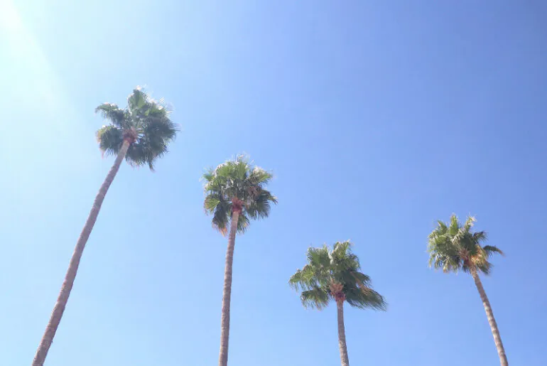 zdjęcie przedstawia cztery palmy widziane od dołu na tle niebieskiego nieba