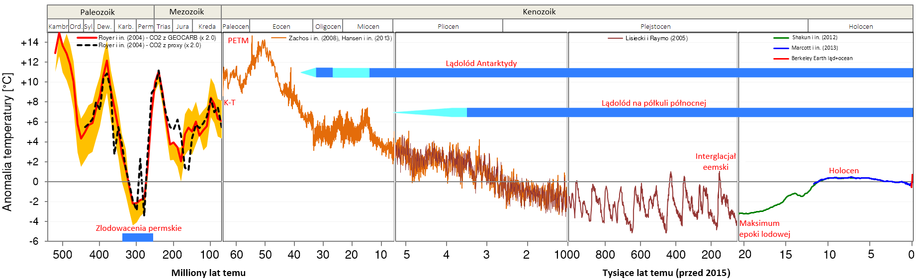Źródła: Fergus, G., Global average temperature estimates for the last 540 My, Wikipedia [https://bit.ly/2iMkWya] Panel 1: 540-65 Mya. Veizer, J. i in., 87Sr/86Sr, d13C and d18O evolution of Phanerozoic seawater, „Chem. Geol.”, 1999 [https://bit.ly/2EgydaL]; Royer, D.L. i in., CO2 as a primary driver of Phanerozoic climate, „GSA Today”, 2004 [https://bit.ly/2DYNDB2].Panel 2: 65-5,3 Mya. Hansen, J. i in., Climate sensitivity, sea level, and atmospheric carbon dioxide, „Phil. Trans. R. Soc. A.”, 2013 [https://bit.ly/2Badik8]; Zachos, J.C., Dickens, G.R., Zeebe, R.E., An Early Cenozoic perspective on greenhouse warming and carbon-cycle dynamics, „Nature”, 2008 [https://bit.ly/2FJYN98]; Zachos, J.C. i in., Extreme warming of mid-latitude coastal ocean during the Paleocene-Eocene Thermal Maximum: Inferences from TEX86 and isotope data, „Geology”, 2006 [https://bit.ly/2FLaPzp]. Panel 3: 5,3-1 Mya. Lisiecki, L.E., Raymo, M.E. A Pliocene-Pleistocene stack of 57 globally distributed benthic δ18O records, „Paleoceanography”, 2005 [https://bit.ly/2EaVefl]; Lisiecki, L.E., Raymo, M.E., Correction to A Pliocene-Pleistocene stack of 57 globally distributed benthic δ18O records, „Paleoceanography”, 2005 [https://bit.ly/2nFaJ4E]; Hansen, J. i in., Climate sensitivity, sea level, and atmospheric carbon dioxide, „Phil. Trans. R. Soc. A.”, 2013 [https://bit.ly/2Badik8]. Panel 4: 1 Mya-20 000 ya. Jouzel, J. i in., EPICA Dome C ice core 800kyr deuterium data and temperature estimates, IGBP PAGES, 2007 [https://bit.ly/2GI17yR]; Jouzel, J. i in., Orbital and millennial Antarctic cimate variability over the past 800,000 years, „Science”, 2007 [https://bit.ly/2BVNKHU]. Panel 5: 20 000 ya-teraz. Andersen, K.K. i in., High-resolution record of Northern Hemisphere climate extending into the last interglacial period, „Nature”, 2004 [https://bit.ly/2nJY9RE]; Johnsen, S.J., Dansgaard, W., White, J.W.C., The origin of Arctic precipitation under present and glacial conditions, Tellus B, 1989 [https://bit.ly/2GMKvWE]; Marcott, S.A. i in., A reconstruction of regional and global temperature for the past 11,300 years, Science, 2013 [https://bit.ly/2FINgqZ]; Instrumental data since 1850, Berkeley Earth project land-ocean dataset, 2014 [https://bit.ly/2zMebiY]; Summary for Policymakers [https://bit.ly/w:] WG1: Climate Change 2013, The Physical Science Basis, IPCC, AR5, 2013 [https://bit.ly/2lXEpJB]
