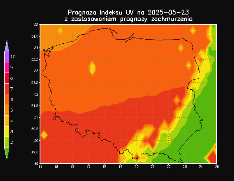 Z przykładowej mapki z 23 maja widać, że już wtedy w większości Polski należało chronić się przed nadmiarem promieniowania i stosować kremy z filtrem. I to nawet, gdy słońce było za chmurami.