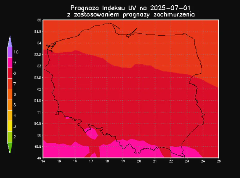 Z kolei prognoza na 1 lipca wskazuje na jeszcze większą potrzebę ochrony przed nadmiarem promieniowania.