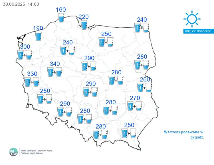 Z kolei z innej podstrony dowiemy się, ile wody stracimy z organizmu w ciągu godziny na skutek pocenia się. Wartości wskaźnika są przedstawione za pomocą szklanek o różnym stopniu wypełnienia i odpowiadającym im wartościom. Możemy również wybrać, czy interesuje nas utrata wody w dniu spędzonym na plażowaniu i odpoczynku, w trakcie spaceru bądź też podczas biegania. A także czy przebywamy w cieniu, czy na słońcu. Odpowiada to trzem rodzajom aktywności: małej, umiarkowanej i dużej. – Latem w czasie upałów na mapie mogą pojawić się wykrzykniki, informujące o tym, że istnieje ryzyko odwodnienia – opowiada Kaliński.