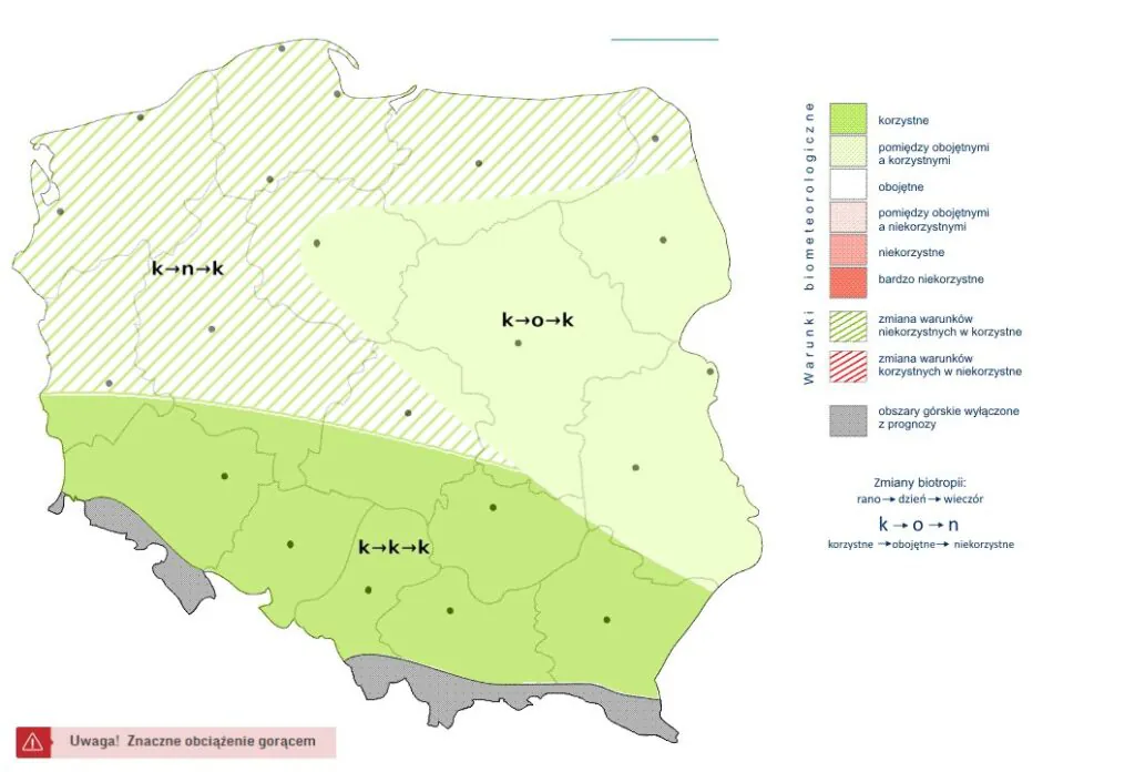 Przedstawione informacje uwzględniają m.in. sytuację baryczną (np. rodzaj mas powietrza i fronty atmosferyczne napływające nad Polskę) i sytuację pogodową (np. czy będzie padało, maksymalną temperaturę i dobową amplitudę temperatury powietrza). Czasami ocena uwzględnia również odczuwalną temperaturę w cieniu. – Informacja taka jest szczególnie przydatna podczas wietrznej pogody, która istotnie wpływa na odbiór środowiska termicznego – wyjaśnia Kaliński.