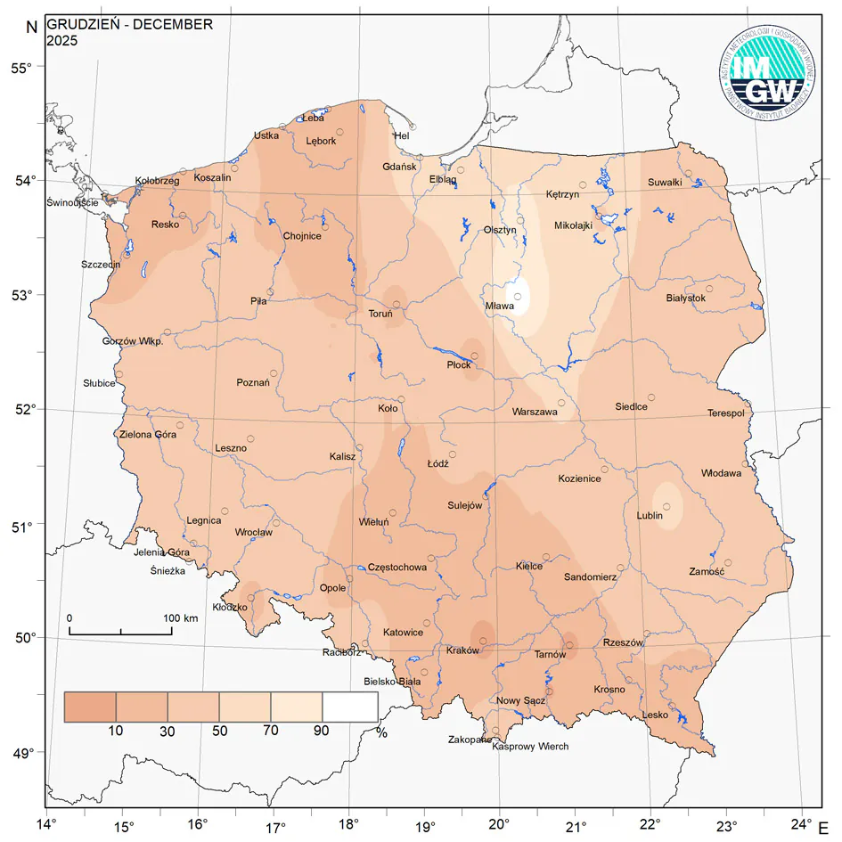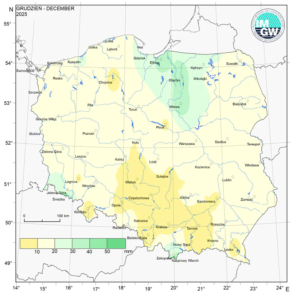 Uśredniona suma opadów atmosferycznych (obejmująca zarówno deszcz, jak i śnieg) wyniosła w grudniu zaledwie 14,5 mm. Była ona aż o 24,4 mm niższa od normy dla tego miesiąca, wyznaczonej na podstawie okresu referencyjnego 1991–2020. Tak niski wynik plasuje miniony grudzień jako miesiąc skrajnie suchy, w którym spadło jedynie 37,3% normy, przy czym niektóre regiony południowe, jak Kraków czy Tarnów, doświadczyły niemal całkowitego braku opadów (poniżej 3 mm, co stanowi 4,8% normy), podczas gdy znaczące sumy opadowe odnotowano w rejonach Mławy (powyżej 45 mm, co stanowi 100,3% normy) oraz w wysokich partiach gór (również powyżej 45 mm). Przestrzenne podsumowanie opadu atmosferycznego z grudnia znajduje się na Il. 3. Statystycznie był to 6. najmniej zasobny w opady grudzień od 1951 roku oraz drugi najsuchszy w XXI wieku (IMGW-PIG, 2026a).