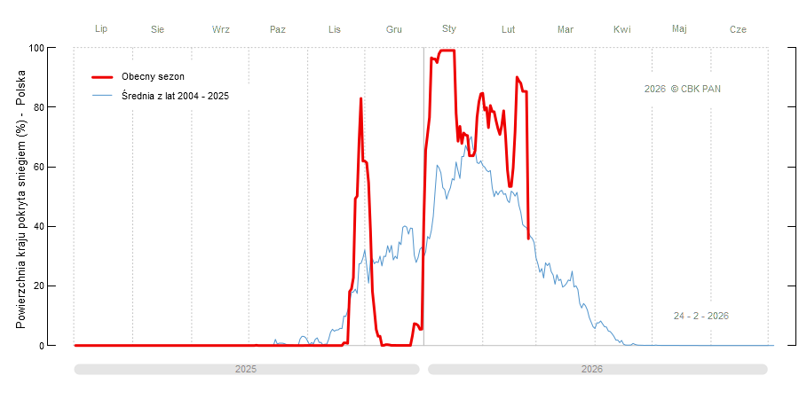 Dane z Centrum Badań Kosmicznych Polskiej Akademii Nauk (CBK PAN) ukazują ciekawy kontrast: po niemal bezśnieżnym grudniu nastąpił długi epizod opadów śniegu. W efekcie przez znaczną część stycznia i lutego biała pokrywa spowijała ponad 80% powierzchni kraju (Il. 5).