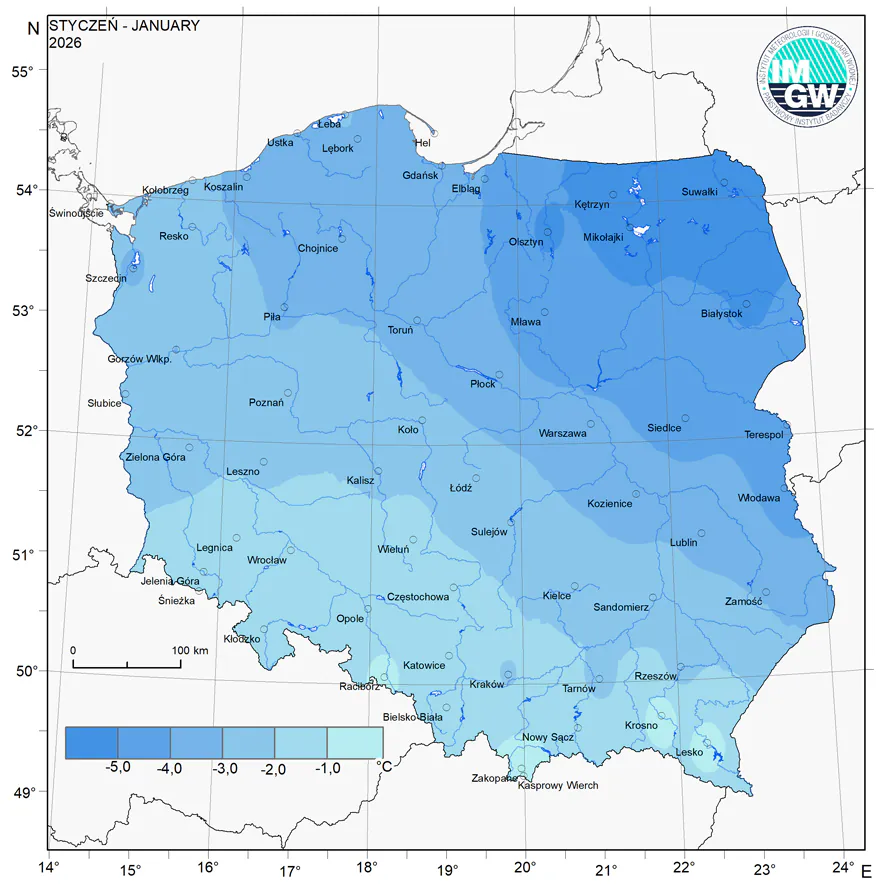 Styczeń przyniósł radykalną zmianę aury, zapisując się jako miesiąc bardzo chłodny, co kontrastowało z rekordowo ciepłym początkiem zimy. Tegoroczny styczeń w Polsce należy zaliczyć do miesięcy bardzo chłodnych, mimo że globalnie był to 5. najcieplejszy styczeń w historii pomiarów instrumentalnych. Średnia obszarowa temperatura wyniosła -4,1°C, co jest wartością o 3°C niższą od normy wieloletniej (1991–2020). Skrajności termiczne były wyjątkowo wyraźne: o ile 26 stycznia w Tarnowie odnotowano niemal wiosenne 8,9°C, o tyle zaledwie kilka dni wcześniej w Zamościu termometry wskazały już -21,3°C.