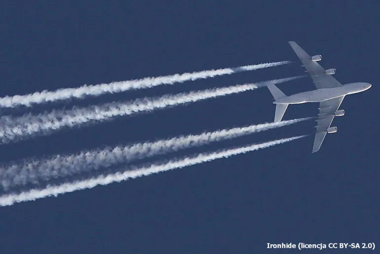 Jednak wpływ transportu lotniczego na klimat nie kończy się na tym. Jeśli popatrzymy na wartość wymuszania radiacyjnego (pojęcie to wyjaśniliśmy w poprzednim tekście), to okaże się, że największe znaczenie ma jeszcze inne zjawisko. Zjawisko, które większość z nas dobrze zna, ale niekoniecznie kojarzy z globalnym ociepleniem. Chodzi o smugi kondensacyjne (ang. condensation trails, w skrócie contrails). To te dobrze widoczne gołym okiem białe ślady zostawiane na niebie przez samoloty. Z fizycznego punktu widzenia są to chmury lodowe powstające w wyższych warstwach troposfery, na wysokości 8–13 km, gdzie temperatura jest niższa niż -35°C. Czyli właśnie tam, gdzie najczęściej latają rejsowe samoloty pasażerskie.