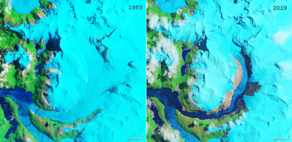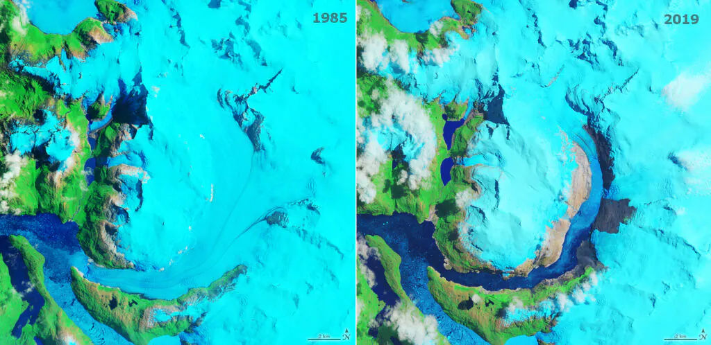 Bardzo wyraźną oznaką antropogenicznej zmiany klimatu jest zmiana zasięgu lodowców. Praktycznie na całym świecie lodowce górskie topnieją. Przykładowo, chilijski lodowiec o technicznej nazwie HPS-12 (Hielo Patagónico Sur 12), znajdujący się w południowej części chilijskich Andów, cofnął się o prawie 13 kilometrów w latach 1985–2018 i stracił więcej niż 30 metrów grubości na końcowym 4-kilometrowym odcinku języka. Porównanie obrazów lodowca, uzyskanych przez satelity Landsat, można zobaczyć w serwisie Earth Obserwatory NASA. Podobny los spotyka także archipelag Svalbard. Globalnie proces topnienia lodowców wywołany antropogeniczną zmianą klimatu powoduje uwolnienie 400 miliardów ton słodkiej wody do oceanów, podnosząc poziom morza (zobacz też Lodowce górskie arktycznej Europy zmierzają ku wyginięciu, ale niektóre mają inne plany, Znikające lodowce tropikalne – dlaczego ich żałujemy?, Jakub Małecki: W Alpach możemy nie mieć lodu za kilkadziesiąt lat).