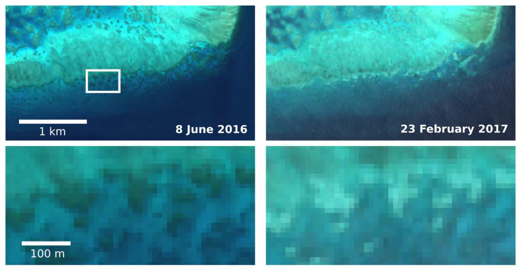 Obecnie pracuje się także nad metodami wykorzystania satelitów do regularnego śledzenia stanu tropikalnych raf koralowych. Te malownicze ekosystemy są coraz częściej narażone na epizody blaknięcia. Są one powodowane przede wszystkim rosnącymi temperaturami oceanu. Gdy temperatura robi się dla koralowców za wysoka, zaczynają oszczędzać swoje zasoby i przestają utrzymywać kolorowe glony, które normalnie pokrywają ich powierzchnię. Tym samym tracą kolor ale też dostęp do substancji odżywczych produkowanych przez glony w procesie fotosyntezy i umierają. Wielkoobszarowe wyblaknięcie rafy koralowej jest całkiem dobrze widoczne na zdjęciach satelitarnych, jednak wyzwaniem jest wiarygodne przetłumaczenie tego co widać na liczby. Zwłaszcza, że zmianę jasności rafy na zdjęciu mogą spowodować także zmiany w kolorze wody i tego, co w niej ewentualnie pływa (tak jak to było w przypadku jezior na Ilustracji 3).