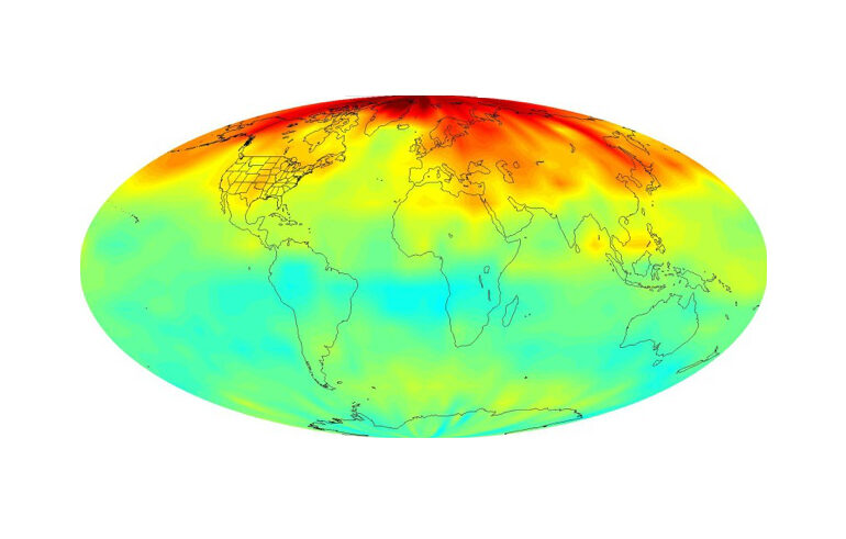 Rysunek 1: Średnie koncentracje dwutlenku węgla w środkowej troposferze (wysokości 5-9km) na podstawie pomiarów za pomocą przyrządu AIRS (satelita Aqua) w kwietniu 2013. Ilustracja dzięki uprzejmości NASA/JPL-Caltech. Średnia globalna wynosiła 396,86 ppmv.