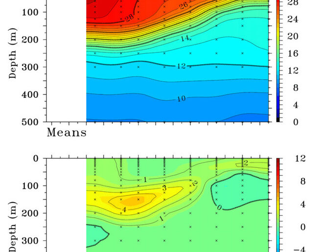 Przekrój temperaturowy oceanu równikowego Pacyfiku.
