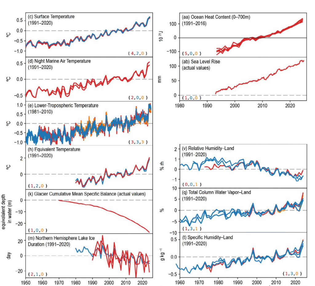 1. Wzrost temperatury dotyczy również oceanów, których zjawisko miejskiej wyspy ciepła nie dotyczy. Poza tym obserwujemy też inne zmiany wielu aspektów systemu klimatycznego, spójne ze wzrostem temperatury.