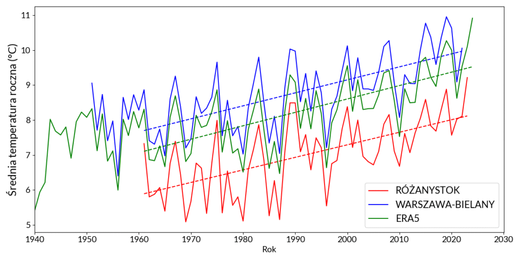 Ilustracją tego może być porównanie pomiarów i położenia stacji klimatologicznej Warszawa-Bielany (Il. 4a), położonej przy Lasku Bielańskim w Warszawie, i w Różanymstoku (wieś w woj. podlaskim o liczbie mieszkańców poniżej 400 osób, Il. 4b). Długoletnie trendy rejestrowane przez obie stacje są niemal identyczne, i bardzo podobne do trendu obliczonego dla średniej obszarowej zmiany temperatury całej Polski (Il. 4c).