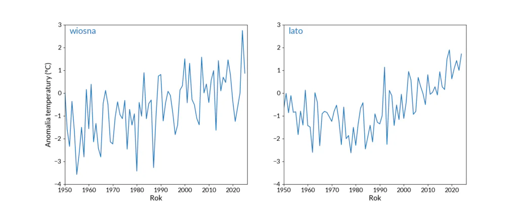 Ilustracja 1: Zmiany średniej temperatury w Polsce wiosną (po lewej) i latem (po prawej). Anomalie temperatury wyrażone są względem średniej 1991-2020. Źródło danych: IMGW-PIB.