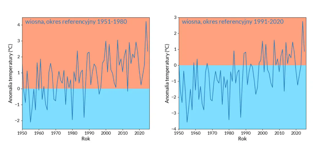 Ilustracja 2: Anomalie średniej temperatury w Polsce wiosną, wyrażone względem dwóch okresów referencyjnych: okresu 1951-1980 (panel lewy), który odpowiada normie klimatycznej z drugiej połowy XX wieku oraz aktualnie używanego 1991-2020 (panel prawy). Niebieskie tło oznacza wartości poniżej normy, pomarańczowe – powyżej. Jak widać, po zmianie normy dużo więcej lat zaczyna kwalifikować się jako „chłodne” (mieszczą się w niebieskiej części wykresu). Źródło danych: IMGW-PIB.