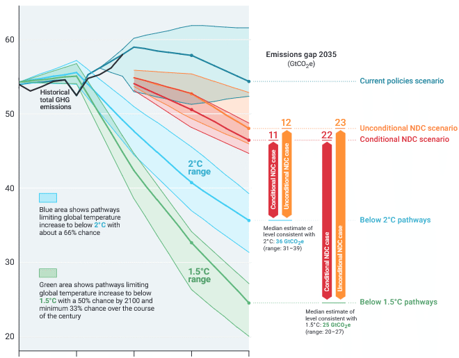 Wykres globalnej emisji gazów cieplarnianych w latach 2015-2024 oraz do roku 2035 według różnych scenariuszy, obrazujących rozdźwięk pomiędzy deklarowaną chęcią ograniczenia globalnego ocieplenia a rzeczywistymi działaniami.