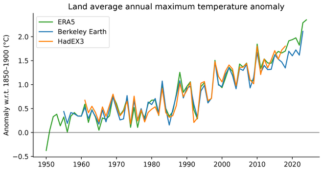 Wykres anomalii temperatury najcieplejszego dnia w roku uśrednionej dla obszarów lądowych planety.