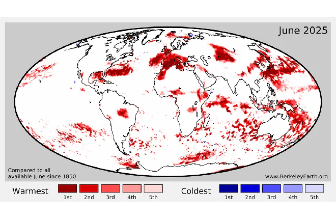 Mapa przedstawiająca pozycję czerwca 2025 w rankingu średniej temperatury miesięcznej względem wszystkich innych czerwców od roku 1850.