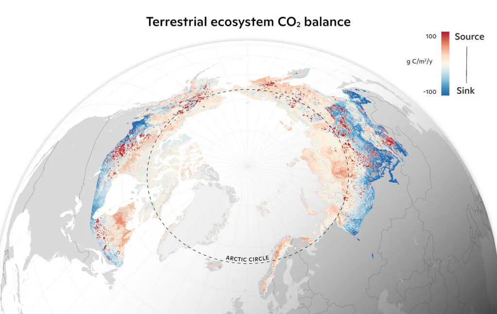 Mapa bilansu dwutlenku węgla w rejonie arktycznej wiecznej zmarzliny, obejmującym zarówno tundrę jak i lasy borealne, w latach 2002-2020.