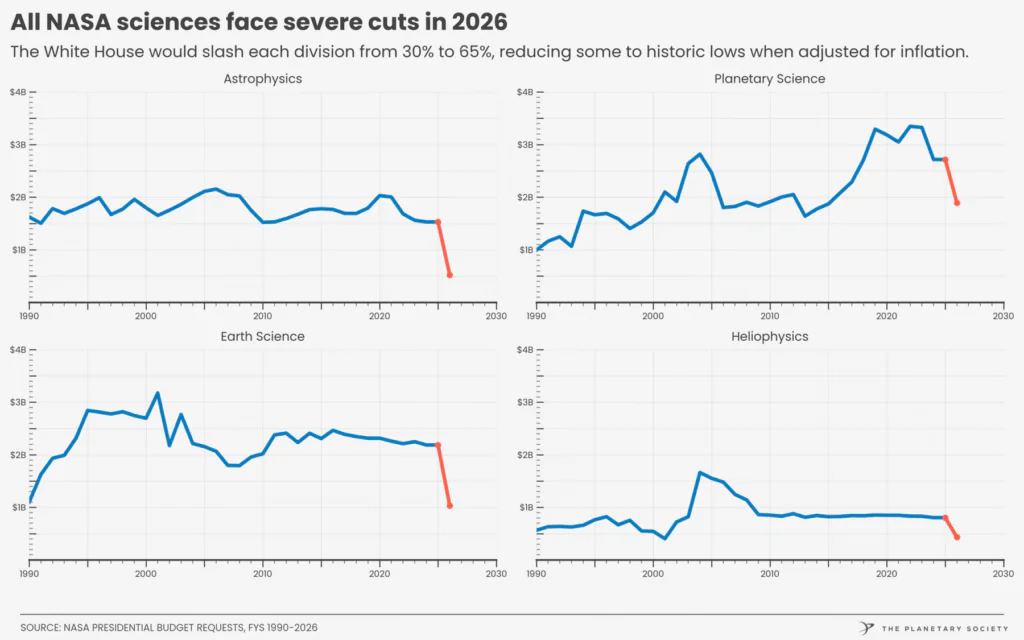 Wykres budżetów czterech głównych działów Dyrektoratu Naukowego amerykańskiej agencji kosmicznej NASA (Science Mission Directorate, SMD): astrofizyki, planetologii, nauk o Ziemi i heliofizyki, oraz cięcia planowane na rok budżetowy 2026.