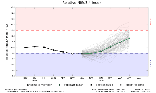 Prognoza względnego indeksu Niño3.4 według wiązki symulacji modelu Australijskiego Biura Meteorologicznego.