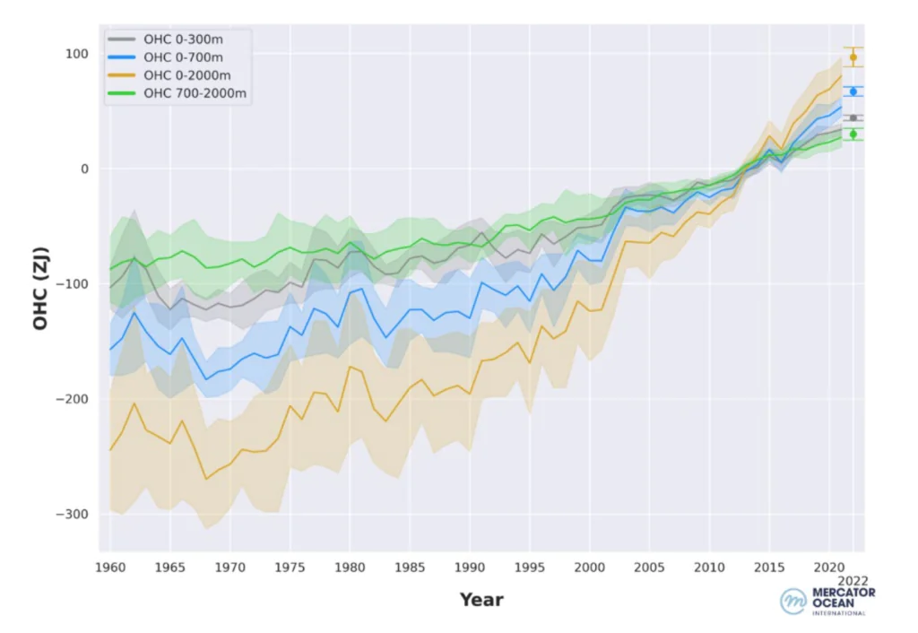 Oś pozioma: czas (lata. Oś pionowa: odchylenie zawartości energii w oceanie (OHC – Ocean Heat Content) od średniej z lat 2005-2021, w zetadżulach (1 ZJ = 1021J).