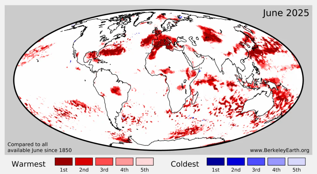 Mapa pokazująca jak ciepły był czerwiec w roku 2025 względem wszystkich innych czerwców od roku 1850. Odcienie koloru czerwonego obrazują pięć najwyższych pozycji w rankingu, a najciemniejszy odcień oznacza że czerwiec w tych miejscach planety rekordowo ciepły. Analogicznie, odcienie koloru niebieskiego pokazują temperatury bliskie najzimniejszemu czerwcowi w historii obserwacji.