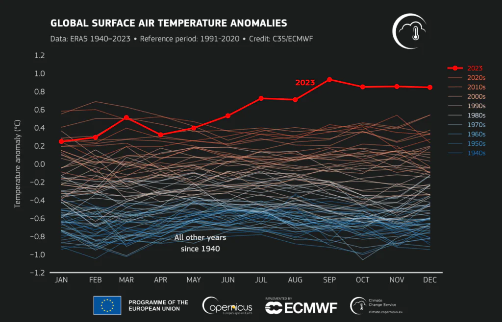 Średnie miesięczne anomalie temperatury (jej odchylenia od średniej z lat 1991-2020 dla odpowiednich miesięcy) w roku 2023 i wcześniejszych, na podstawie reanalizy ERA5.