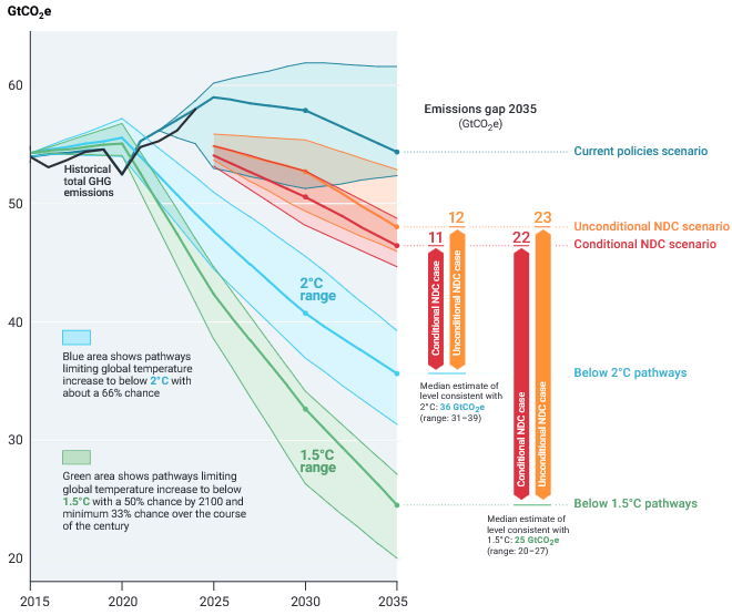 Kolor zielony: klasa scenariuszy IPCC ograniczająca globalne ocieplenie w roku 2100 do poziomu 1,5 stopnia Celsjusza ponad poziomem przedindustrialnym z 50% prawdopodobieństwem i niewielkim (maksymalnie 33%) prawdopodobieństwem przestrzelenia tego celu w ciągu całego stulecia. Kolor niebieski: klasa scenariuszy IPCC ograniczająca globalne ocieplenie w roku 2100 do poziomu 2 stopni Celsjusza ponad poziomem przedindustrialnym z 66% prawdopodobieństwem. Kolor czerwony: zakres emisji wynikających z deklarowanych, warunkowych polityk klimatycznych. Kolor pomarańczowy: zakres emisji wynikających z deklarowanych, bezwarunkowych polityk klimatycznych. Kolor morski: zakres emisji wynikających z rzeczywistych, wdrożonych polityk klimatycznych.