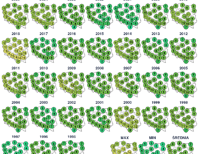 Mapy średniej temperatury miesiąca kwietnia dla największych miast w Polsce w ostatnim trzydziestoleciu według danych ze stacji synoptycznych Instytutu Meteorologii i Gospodarki Wodnej, oraz (prawy dolny róg) wartości maksymalne, minimalne i średnie dla każdego miasta.