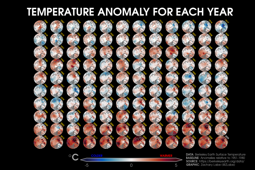 Mapy średniorocznej anomalii temperatury w obszarze Arktyki od 1906 do 2025 roku. Kolory przedstawiają wartości anomalii temperatury w każdym roku, względem średniej z okresu 1951-1980: odcienie niebieskiego to obszary chłodniejsze, a czerwonego – cieplejsze niż średnia w tym okresie bazowym.