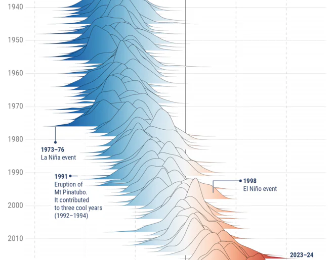 Każdy z 86 indywidualnych wykresów pokazuje rozkład częstości występowania różnych wartości anomalii dobowych w danym roku kalendarzowym. Kolorami oznaczono wartości samych anomalii: odcienie niebieskiego dla wartości ujemnych (chłodniejszych niż średnia klimatologiczna 1991-2020), czerwonego dla wartości dodatnich (cieplejszych). Zaznaczono też kilka historycznych zdarzeń mających wpływ na temperaturę globalną, jak silne epizody El Niño i La Niña, a także najsilniejszy w ciągu ostatniego stulecia wybuch wulkanu Pinatubo zw1991 roku.