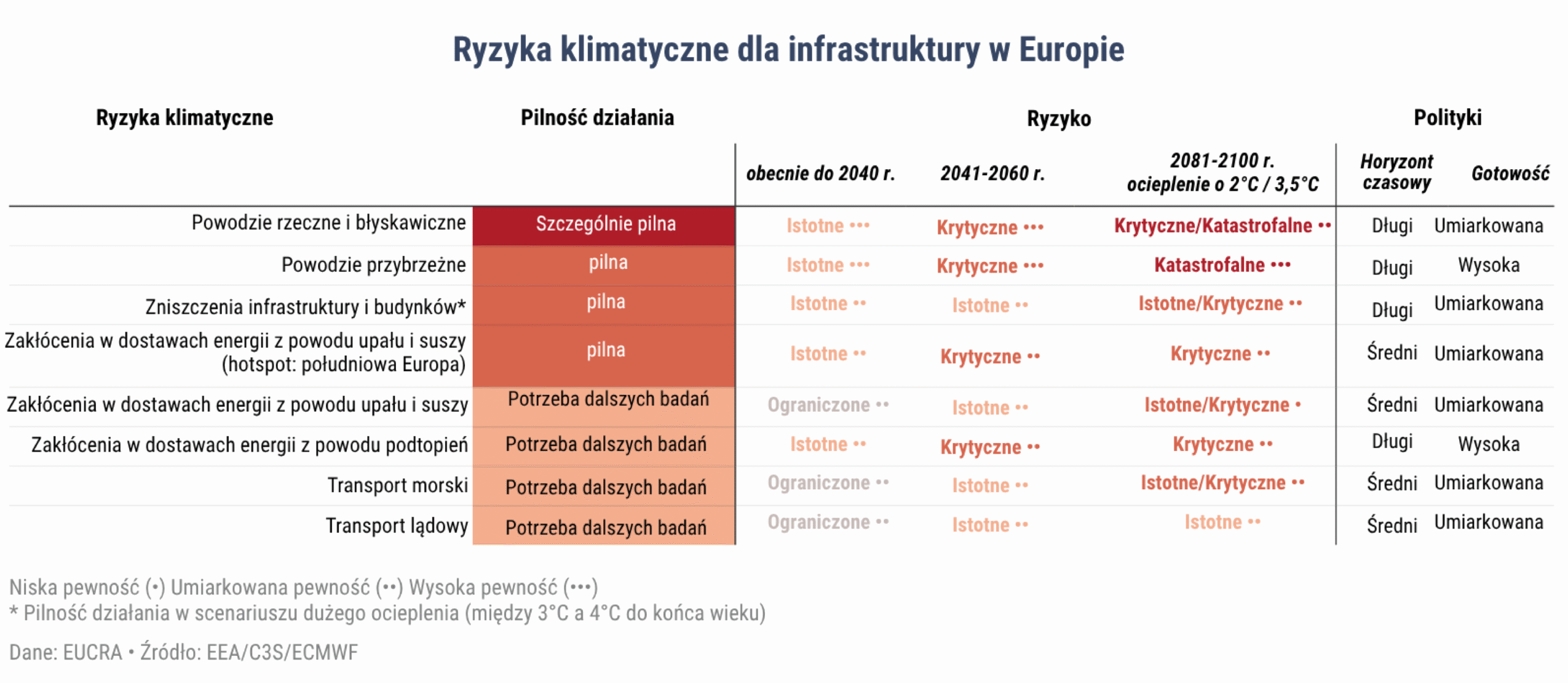 Ryzyka klimatyczne dla infrastruktury w Europie zostały opracowane przez Europejską Agencję Środowiska (EEA) i przedstawiają zarówno aktualne, jak i potencjalne zagrożenia wynikające z postępujących zmian klimatycznych. Ocena pilności działań adaptacyjnych uwzględnia czynniki przedstawione w dalszych kolumnach: dotkliwość konsekwencji, poziom niepewności, a także istniejące polityki. Gotowość polityk (policy readiness) i ich horyzont czasowy (policy horizon) wskazują na ile aktualne polityki są zdolne do skutecznej reakcji na zidentyfikowane ryzyka klimatyczne jak i perspektywę czasową, którą obejmują.