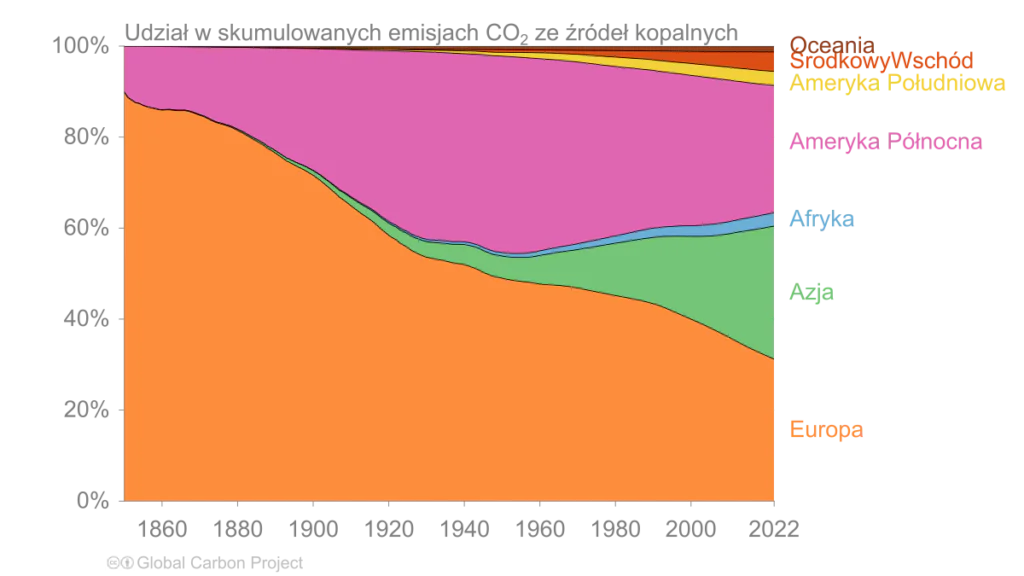 Oś pozioma: czas (lata). Oś pionowa: udział poszczególnych regionów w całkowitych skumulowanych emisjach CO2 ze źródeł kopalnych.