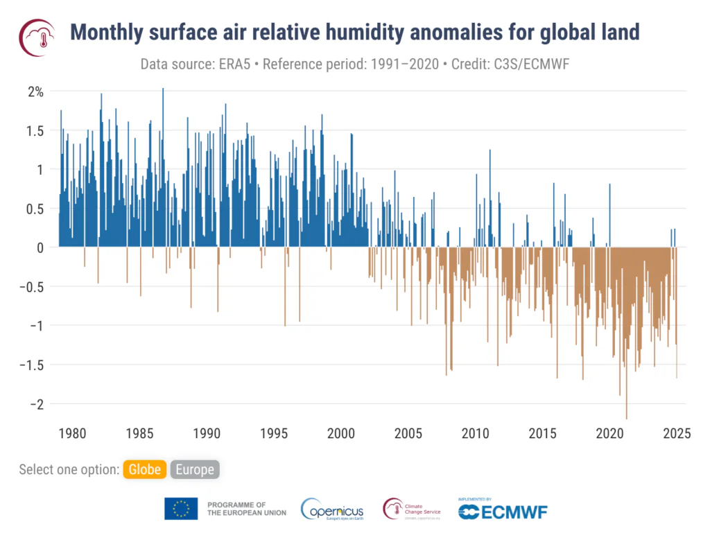 Wraz z postępującym globalnym ociepleniem zawartość pary wodnej w atmosferze rośnie, co oznacza wzrost wilgotności bezwzględnej. Ponieważ jednak obszary lądowe ogrzewają się w szybszym tempie niż oceany, wilgotność względna — opisująca jak daleko od stanu całkowitego nasycenia parą wodną znajduje się powietrze — nad obszarami lądowymi w mierzalny sposób zmalała w ostatnich dekadach.